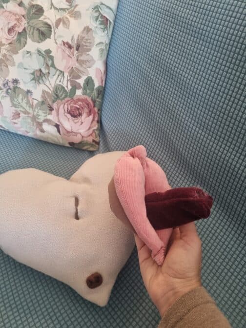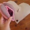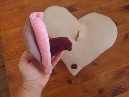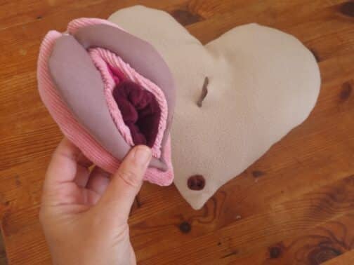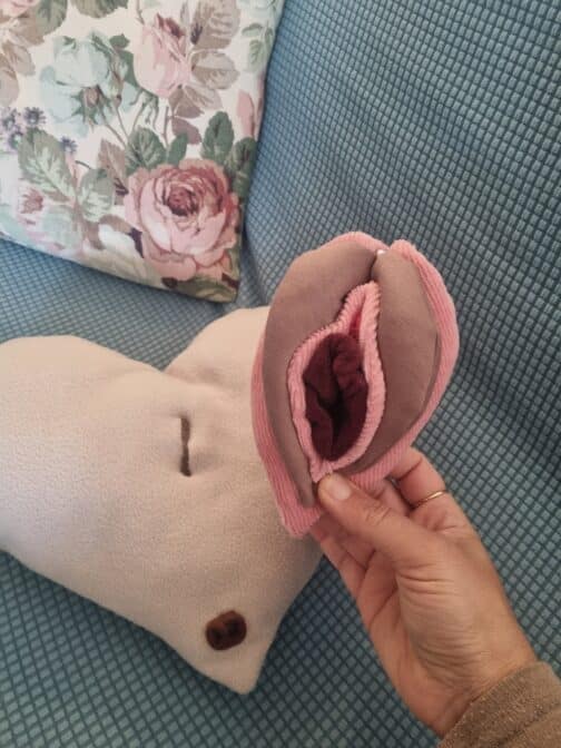 תפור מבדים רכים ונעימים. מורכב משני חלקים – כרית לב מבד פליז ודגם פות ונרתיק. ניתן לשלוף את דגם הפות והנרתיק מהכרית כדי להדגים עליו באופן נפרד.