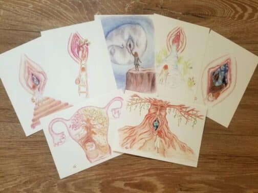 סט גלויות של אנטומיה אינטימית מתאים לשימוש בקליניקה נשית או בסדנאות והדרכות בתחום הנשיות, מיניות, פוריות ועוד… כמו גם לשימוש פרטי לטובת השראה ותמיכה במסע פנימי.